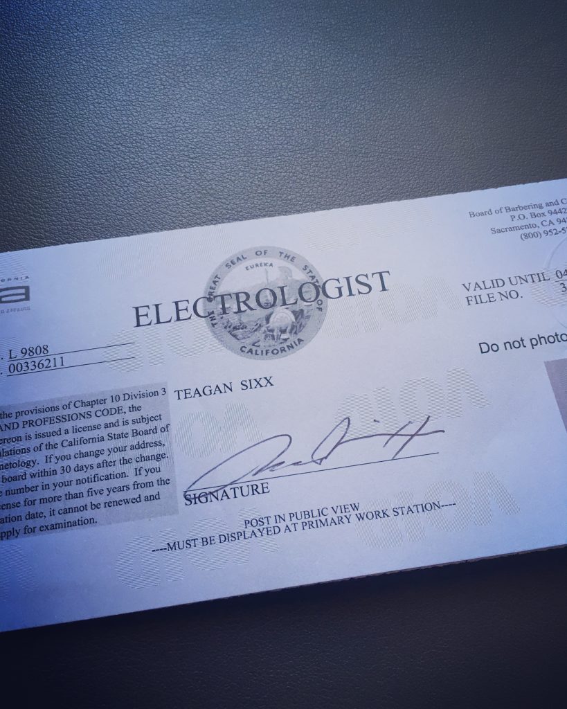 カリフォルニア州Electrologist(美容電気脱毛士)ライセンス保有